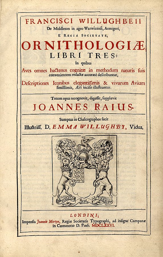 Willughby’s Ornithology, which described every bird then known. Title Page from Wikimedia Commons.